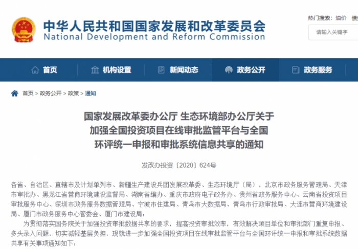 《通知》要求,加強(qiáng)全國(guó)投資項(xiàng)目在線審批監(jiān)管平臺(tái)與全國(guó)環(huán)評(píng)統(tǒng)一申報(bào)和審批系統(tǒng)數(shù)據(jù)共享。