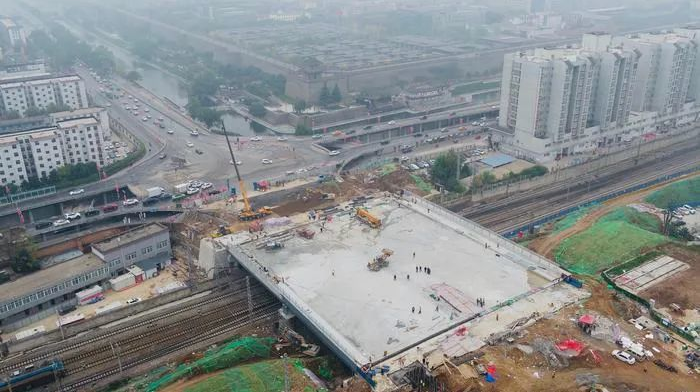 據(jù)了解,西安太華路立交橋建于1992年,橋長(zhǎng)22米,寬34米,位于西安火車(chē)站東咽喉區(qū),跨隴海鐵路上下行正線。西安太華路立交橋改擴(kuò)建項(xiàng)目,是西安火車(chē)站改擴(kuò)建工程的重要環(huán)節(jié)、南北站場(chǎng)改建的控制性工程。按照西安市政規(guī)劃,該橋改擴(kuò)建后為兩跨三幅,橋長(zhǎng)65米,寬63米,箱梁44片。因舊橋拆除、新橋建設(shè)均在隴海鐵路營(yíng)業(yè)線或鄰近營(yíng)業(yè)線施工,施工難度大、安全風(fēng)險(xiǎn)高。