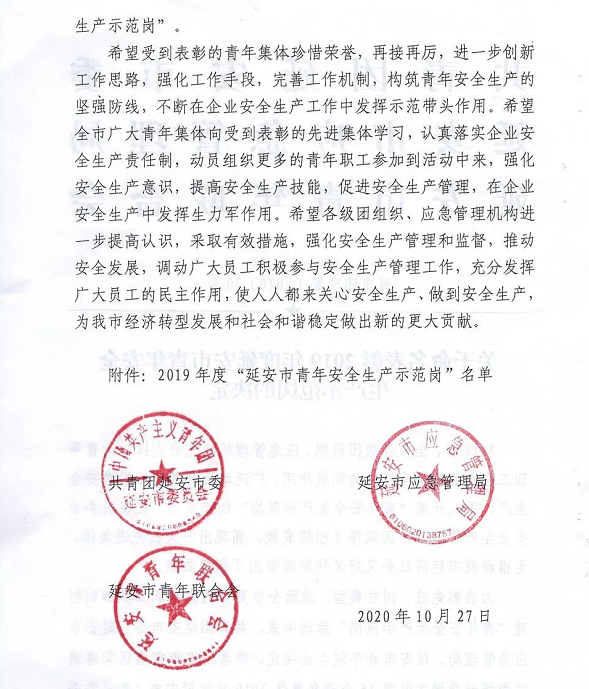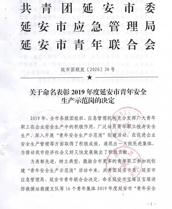 公司多個集體榮獲“延安市青年安全生產(chǎn)示范崗”稱號 |