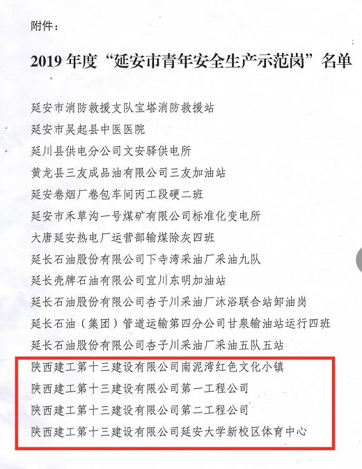 近日,共青團延安市委、延安市應急管理局、延安市青年聯(lián)合會聯(lián)合下發(fā)《關于命名表彰2019年度延安市青年安全生產(chǎn)示范崗的決定》,陜建十三建公司第一工程公司、第二工程公司、南泥灣紅色文化小鎮(zhèn)項目部、延安大學新校區(qū)體育中心項目部四個集體榮獲2019年度“延安市青年安全生產(chǎn)示范崗”榮譽稱號。