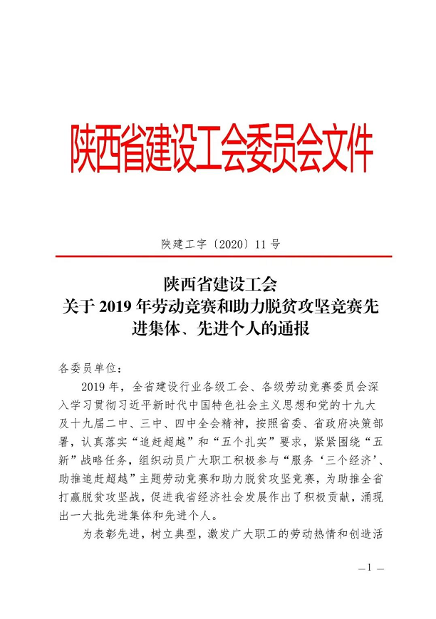 公司工會(huì)榮獲“陜西省建設(shè)系統(tǒng)勞動(dòng)競賽先進(jìn)集體”稱號(hào) |